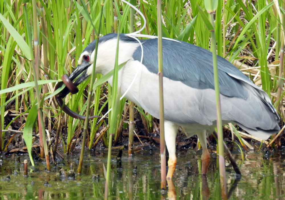 しかし、捕まえられたほうも必死で抵抗します。長い体をくねらせてゴイサギのクチバシに巻き付いたり、回りの草に絡みついたりします。