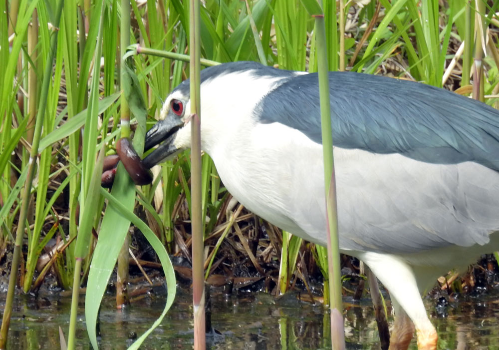 じっと動かなかったゴイサギが水中に一撃を叩き込みました。水中から持ち上げたクチバシにはニョロニョロと体をくねらせるウナギのような生き物が捕らえられていました!