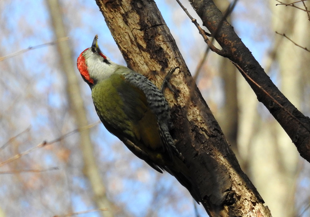アオゲラは上を向いたときに見える赤い頭が特徴的ですね。